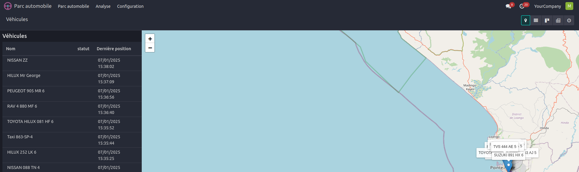 Il en ressort que nous avons implémenté de telles façon à recueillir les données importantes telles que le repérages(latitude,longitude,altitude), la vitesse et le voltage puis la gestion des alertes vidanges et la valeur limite quand cela genèrera de façon automatique.Odoo ayant déjà une vue cartographique intégré, nous avons pu afficher ces véhicules avec le tableau d'affichage des informations telles que le statut,la dernière position et la marque ou l'immatriculation.