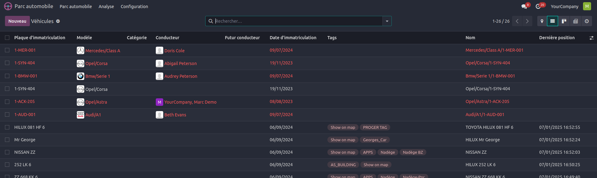 | Intégration avec des dispositifs GPS: Compatible avec une vaste gamme d'appareils de suivi GPS; Prend en charge différents types de capteurs pour des informations complémentaires(température, portes,etc) | Intégration avec d'autres modules odoo: En harmonie