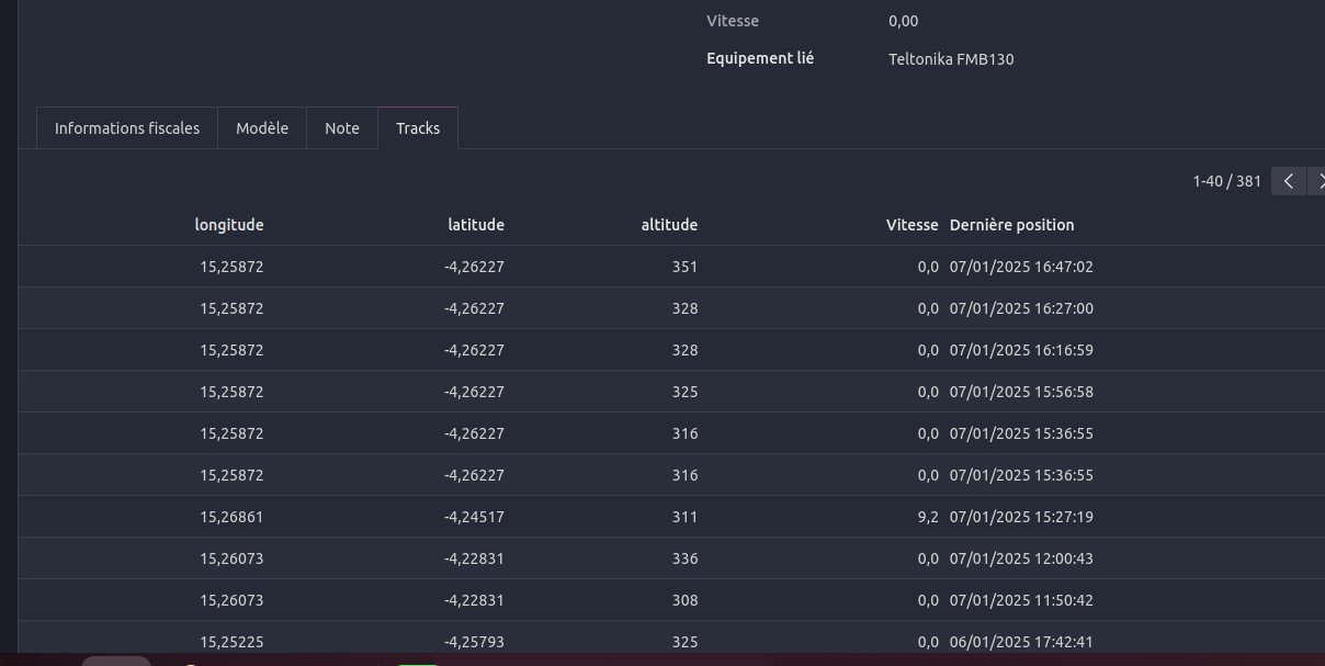 Pour voir l'historique des kilométrages et autre , nous défilons sur le sous onglet 'Track' comme cette image: