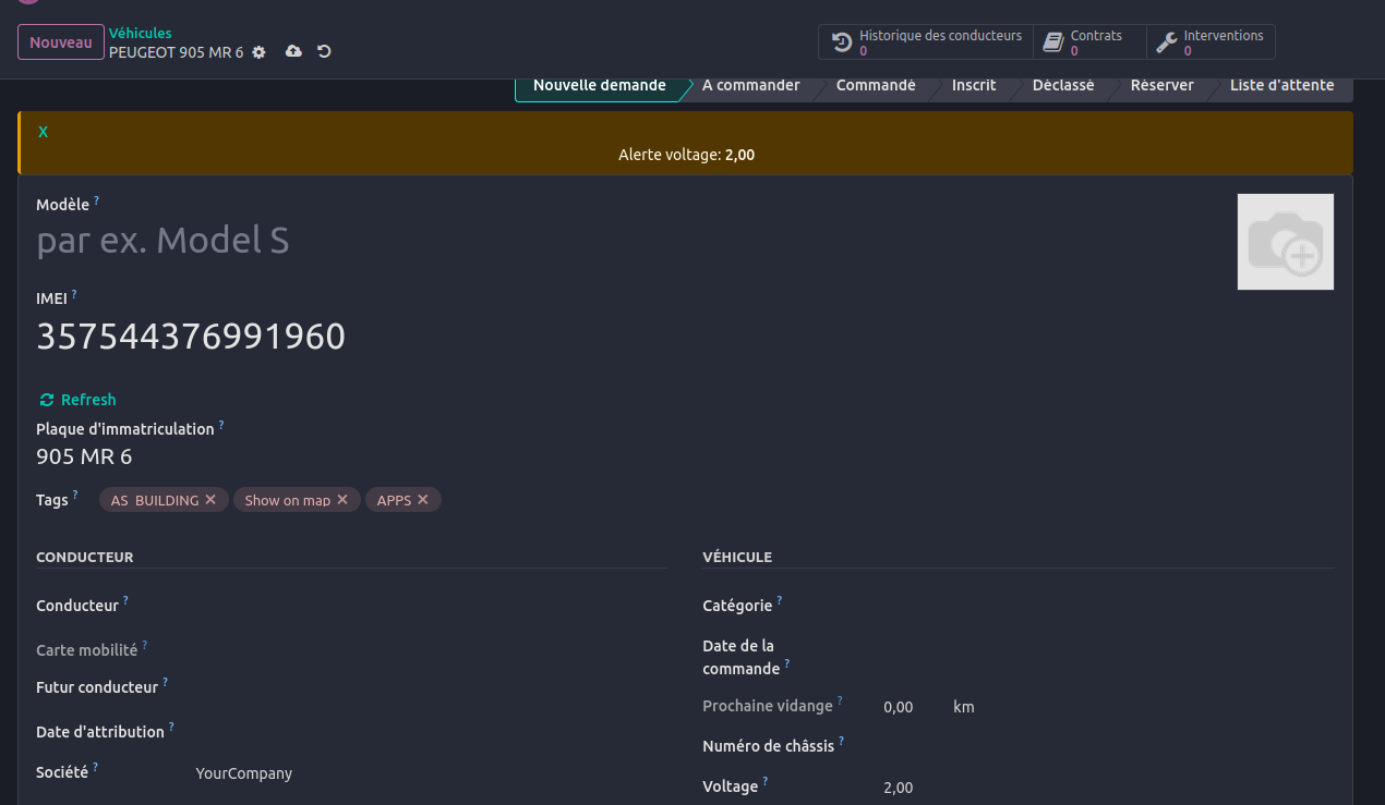 Dans le cas de l'alerte batterie,allez sur le formulaire de création d'un véhicule et tentez de saisir manuellement mais sinon généralement se fait automatiquement: